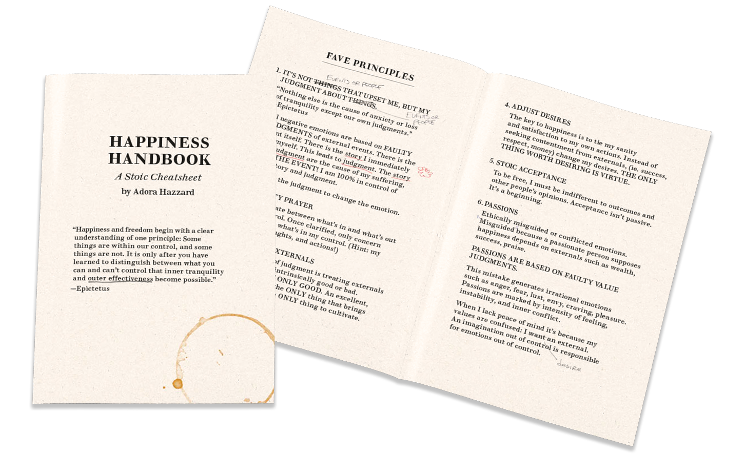 Also featured is a custom booklet I designed using the author’s own handwritten notes, presented as the philosophy workbook main character, Adora, uses for her own Stoicism practice.